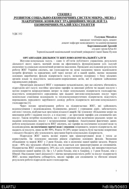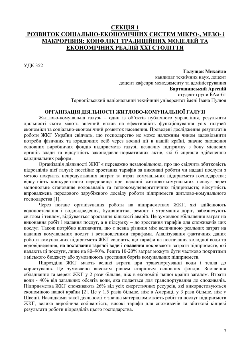 Bibliographic citation (APA): Halushchak, M. P., & Bartoshinskii, A. (2025). Orhanizatsiia diialnosti zhytlovo-komunalnoi haluzi. Proceedings of the 15 International Scientific-Practical Conference “Formation of the mechanism of national economic systems competitive positions strengthening in global, regional and local dimensions”, 17 November 2025, Ternopil, 7-8. PE Palianytsia V. A.. [in Ukrainian].