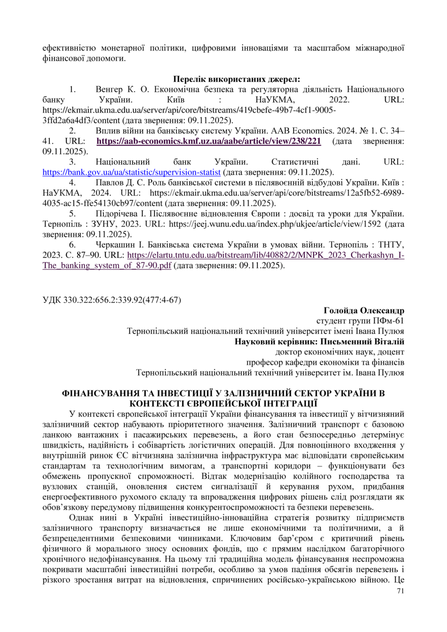 | Bibliographic citation (APA): | Holoida, O. (2025). Finansuvannia ta investytsii u zaliznychnyi sektor Ukrainy v konteksti yevropeiskoi intehratsii. Proceedings of the 15 International Scientific-Practical Conference “Formation of the mechanism of national economic systems competitive positions strengthening in global, regional and local dimensions”, 17 November 2025, Ternopil, 71-73. PE Palianytsia V. A.. [in Ukrainian]. |