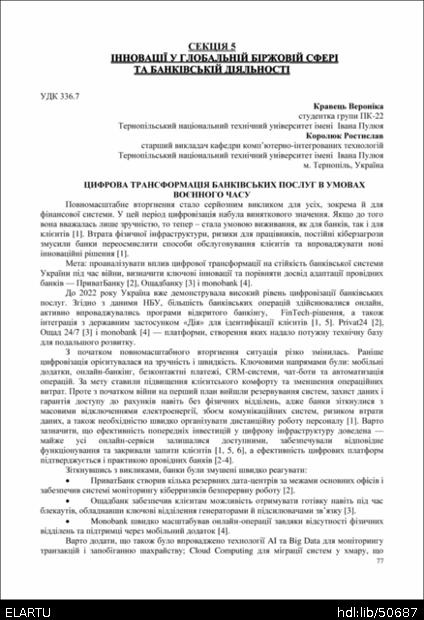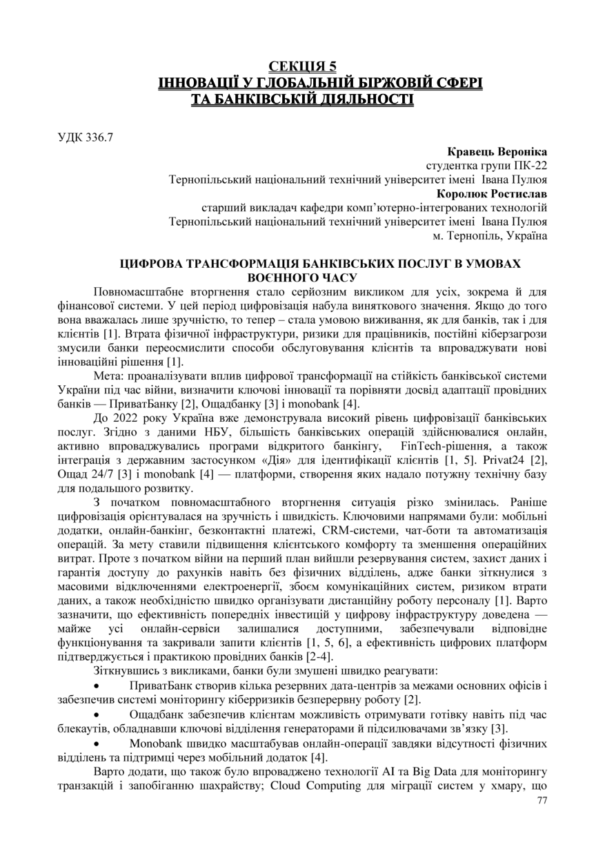 | Bibliographic citation (APA): | Kravets, V., & Koroliuk, R. I. (2025). Tsyfrova transformatsiia bankivskykh posluh v umovakh voiennoho chasu. Proceedings of the 15 International Scientific-Practical Conference “Formation of the mechanism of national economic systems competitive positions strengthening in global, regional and local dimensions”, 17 November 2025, Ternopil, 77-78. PE Palianytsia V. A.. [in Ukrainian]. |