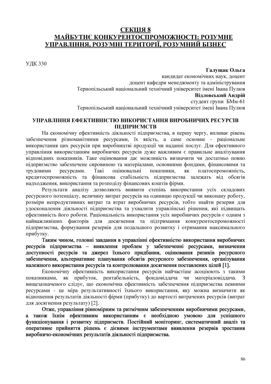 | Bibliographic citation (APA): | Halushchak, O. Ia., & Vidlovskyi, A. (2025). Upravlinnia efektyvnistiu vykorystannia vyrobnychykh resursiv pidpryiemstv. Proceedings of the 15 International Scientific-Practical Conference “Formation of the mechanism of national economic systems competitive positions strengthening in global, regional and local dimensions”, 17 November 2025, Ternopil, 86-87. PE Palianytsia V. A.. [in Ukrainian]. |