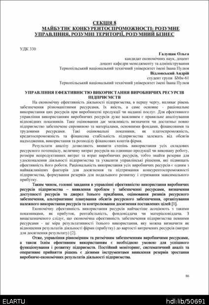 | Bibliographic citation (CHICAGO): | Halushchak O. Ya., Vidlovskyi A. (2025) Upravlinnia efektyvnistiu vykorystannia vyrobnychykh resursiv pidpryiemstv. Proceedings of the 15 International Scientific-Practical Conference “Formation of the mechanism of national economic systems competitive positions strengthening in global, regional and local dimensions” (Tern., 17 November 2025), pp. 86-87 [in Ukrainian]. |