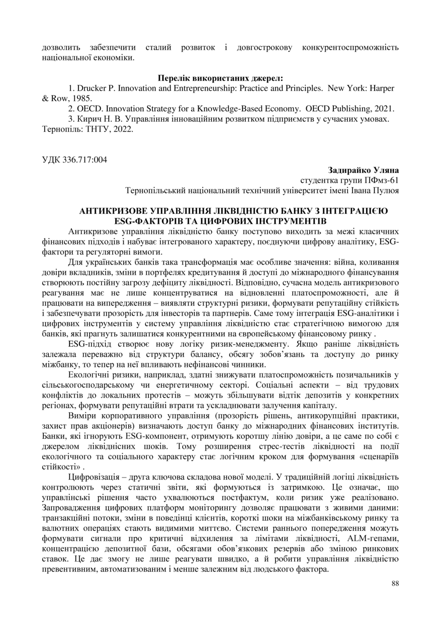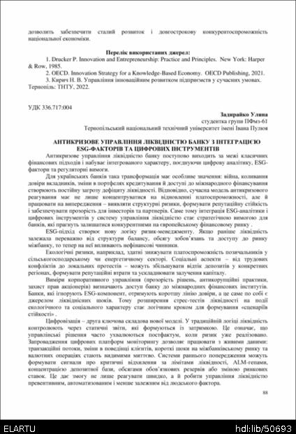 | Bibliographic citation (APA): | Zadiraiko, U. (2025). Antykryzove upravlinnia likvidnistiu banku z intehratsiieiu ESG-faktoriv ta tsyfrovykh instrumentiv. Proceedings of the 15 International Scientific-Practical Conference “Formation of the mechanism of national economic systems competitive positions strengthening in global, regional and local dimensions”, 17 November 2025, Ternopil, 88-89. PE Palianytsia V. A.. [in Ukrainian]. |