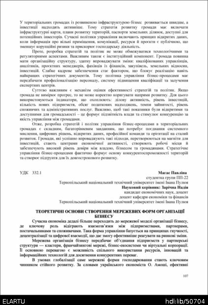 Бібліографічний опис: Магас П. Теоретичні основи створення мережевих форм організації бізнесу / Магас Павліна // Матеріали ⅩⅤ Міжнародної науково-практичної конференції „Формування механізму зміцнення конкурентних позицій національних економічних систем у глобальному, регіональному та локальному вимірах“, 17 листопада 2025 року. — Т. : ФОП Паляниця В. А., 2025. — С. 107–108. — (Трансформація бізнес-процесів у контексті сталого розвитку).