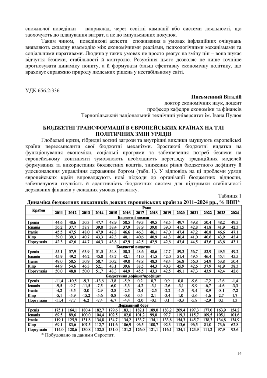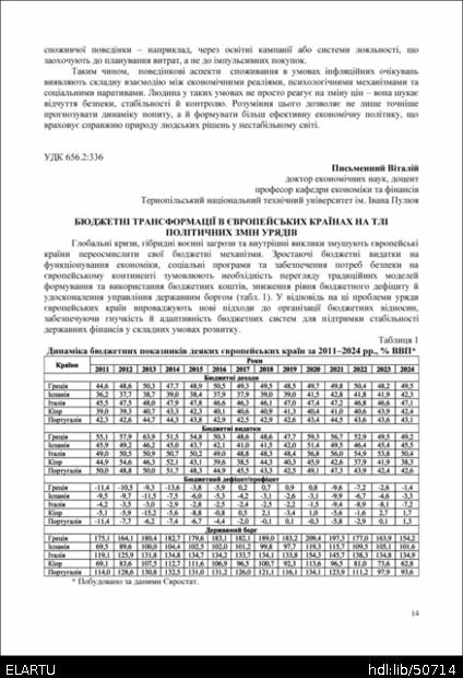 | Bibliographic citation (APA): | Pismennii, V. V. (2025). Biudzhetni transformatsii v yevropeiskykh krainakh na tli politychnykh zmin uriadiv. Proceedings of the 15 International Scientific-Practical Conference “Formation of the mechanism of national economic systems competitive positions strengthening in global, regional and local dimensions”, 17 November 2025, Ternopil, 14-16. PE Palianytsia V. A.. [in Ukrainian]. |
