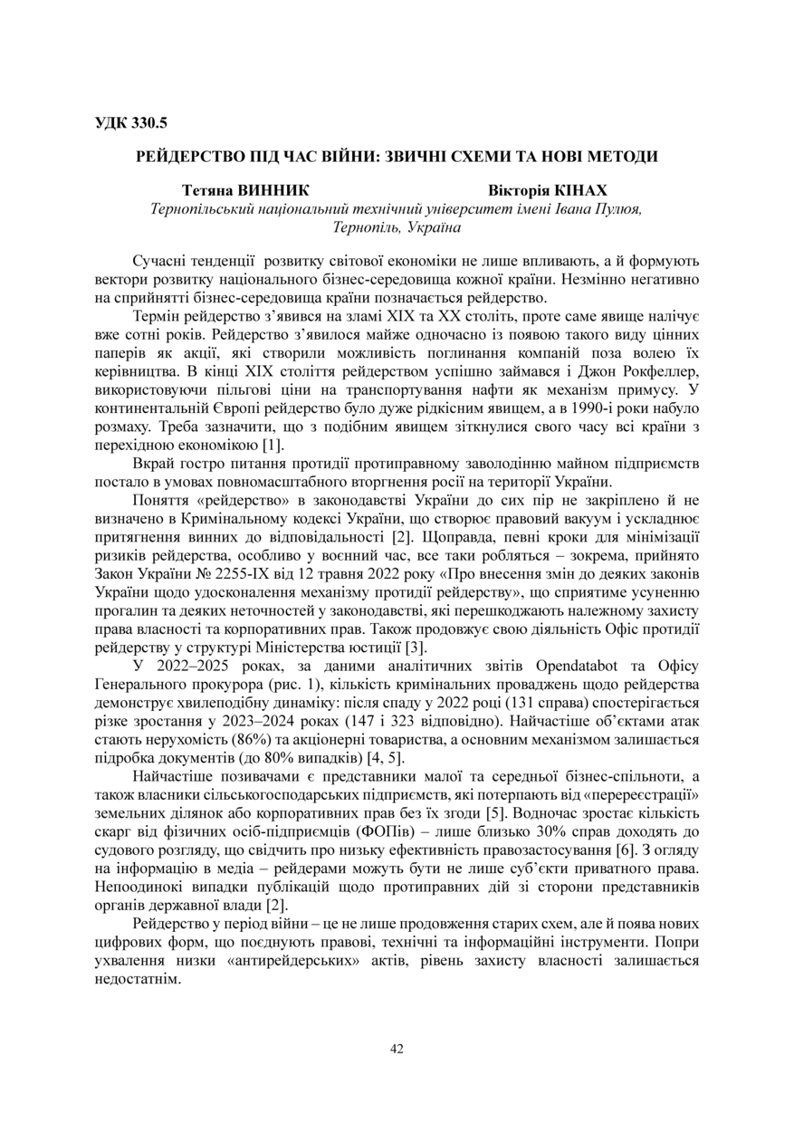| Bibliographic citation (APA): | Vinnik, T. M., & Kinakh, V. (2025). Reiderstvo pid chas viiny: zvychni skhemy ta novi metody. Proceeding of Ⅳ International Scientific and Practical Conference: “Business Transformation for Sustainable Future: Research, Digitalization and Innovation”, 4-5 December 2025, Ternopil, 42-44. FOP Palyanytsya V. A.. [in Ukrainian]. |
