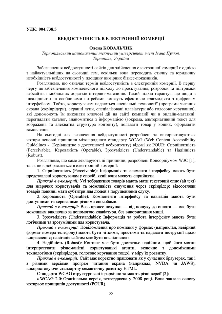 | Bibliographic citation (APA): | Kovalchik, O. A. (2025). Vebdostupnist v elektronnii komertsii. Proceeding of Ⅳ International Scientific and Practical Conference: “Business Transformation for Sustainable Future: Research, Digitalization and Innovation”, 4-5 December 2025, Ternopil, 55-57. FOP Palyanytsya V. A.. [in Ukrainian]. |
