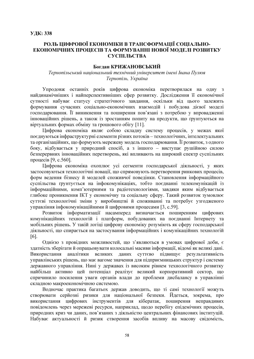 | Bibliographic citation (APA): | Krizhanovskii, B. (2025). Rol tsyfrovoi ekonomiky v transformatsii sotsialno-ekonomichnykh protsesiv ta formuvanni novoi modeli rozvytku suspilstva. Proceeding of Ⅳ International Scientific and Practical Conference: “Business Transformation for Sustainable Future: Research, Digitalization and Innovation”, 4-5 December 2025, Ternopil, 58-60. FOP Palyanytsya V. A.. [in Ukrainian]. |