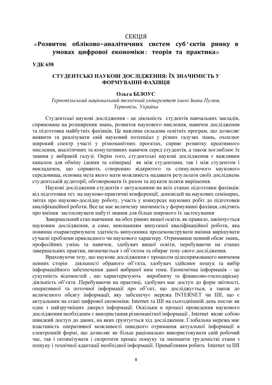 | Bibliographic citation (APA): | Bilous, O. S. (2025). Studentski naukovi doslidzhennia: yikh znachymist u formuvanni fakhivtsia. Proceeding of Ⅳ International Scientific and Practical Conference: “Business Transformation for Sustainable Future: Research, Digitalization and Innovation”, 4-5 December 2025, Ternopil, 8-9. FOP Palyanytsya V. A.. [in Ukrainian]. |
