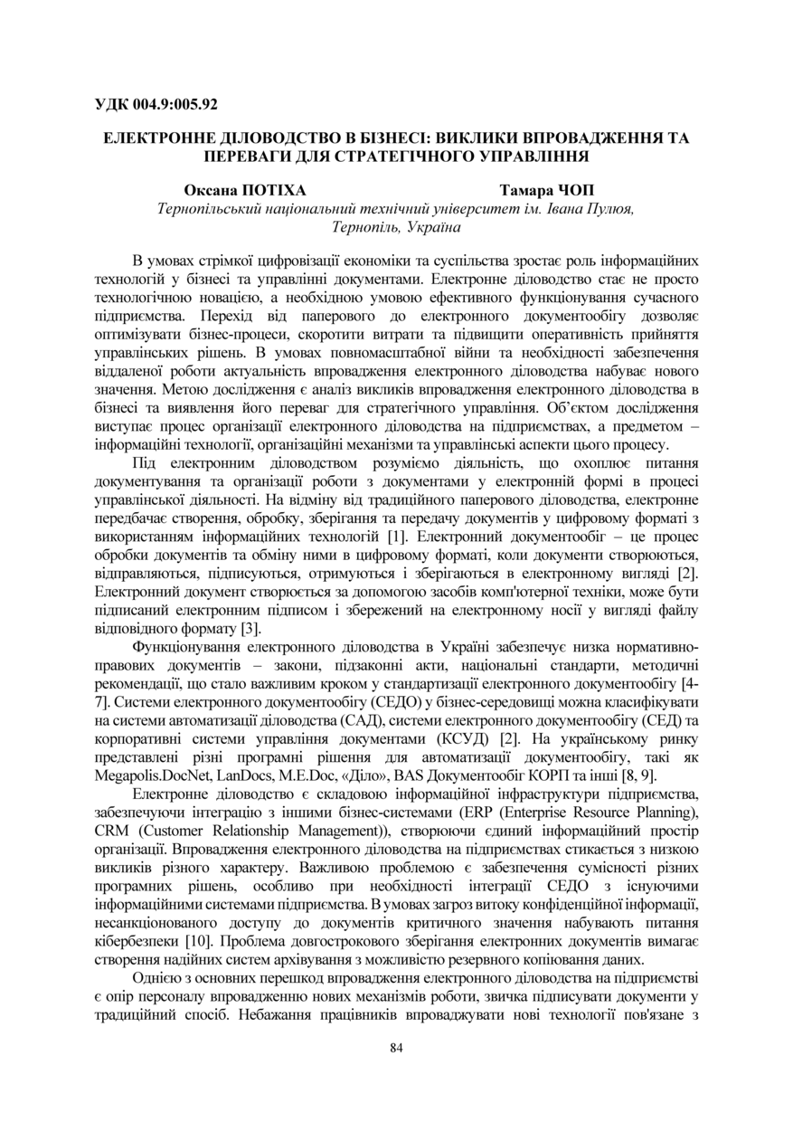 | Bibliographic citation (APA): | Potikha, O. B., & Chop, T. O. (2025). Elektronne dilovodstvo v biznesi: vyklyky vprovadzhennia ta perevahy dlia stratehichnoho upravlinnia. Proceeding of Ⅳ International Scientific and Practical Conference: “Business Transformation for Sustainable Future: Research, Digitalization and Innovation”, 4-5 December 2025, Ternopil, 84-87. FOP Palyanytsya V. A.. [in Ukrainian]. |