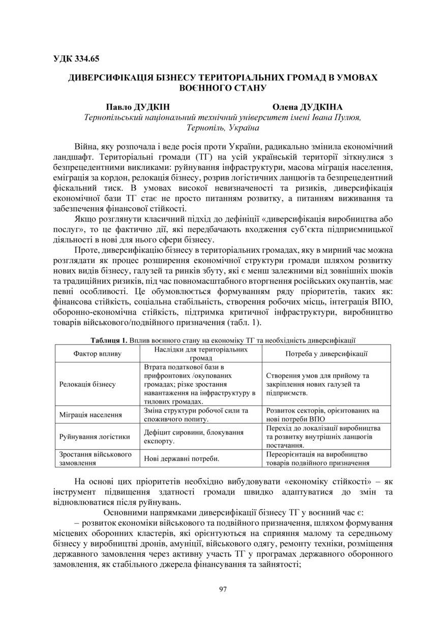 | Bibliographic citation (APA): | Dudkin, P. D., & Dudkina, O. (2025). Dyversyfikatsiia biznesu terytorialnykh hromad v umovakh voiennoho stanu. Proceeding of Ⅳ International Scientific and Practical Conference: “Business Transformation for Sustainable Future: Research, Digitalization and Innovation”, 4-5 December 2025, Ternopil, 97-98. FOP Palyanytsya V. A.. [in Ukrainian]. |