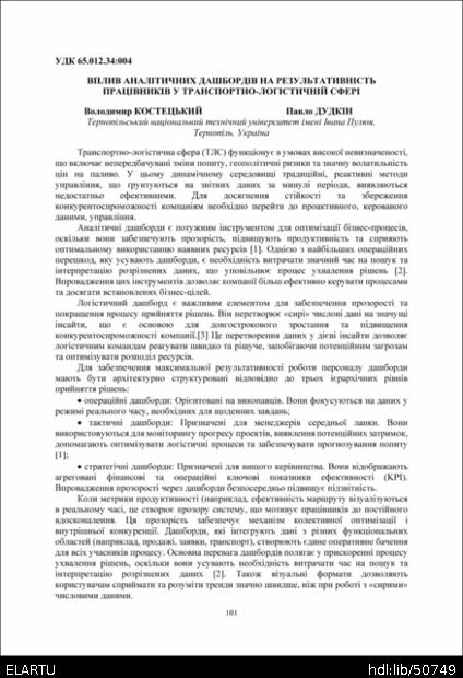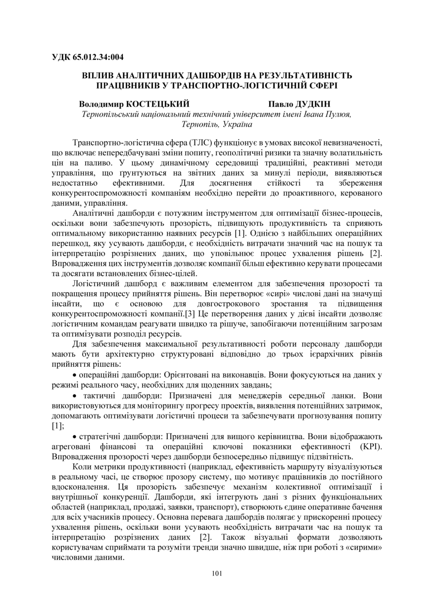 | Bibliographic citation (APA): | Kostetskii, V., & Dudkin, P. D. (2025). Vplyv analitychnykh dashbordiv na rezultatyvnist pratsivnykiv u transportno-lohistychnii sferi. Proceeding of Ⅳ International Scientific and Practical Conference: “Business Transformation for Sustainable Future: Research, Digitalization and Innovation”, 4-5 December 2025, Ternopil, 101-102. FOP Palyanytsya V. A.. [in Ukrainian]. |