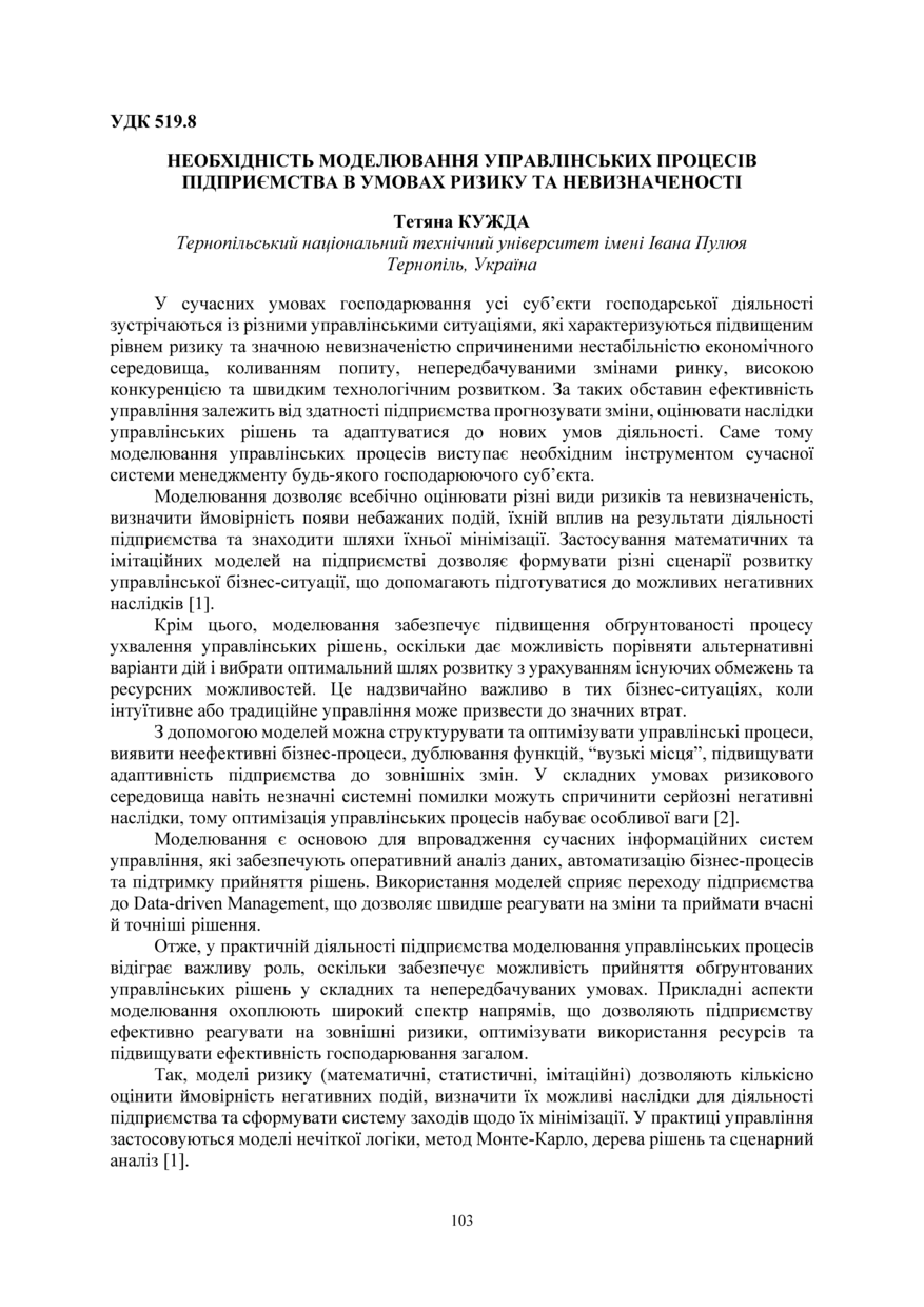 | Bibliographic citation (APA): | Kuzhda, T. I. (2025). Neobkhidnist modeliuvannia upravlinskykh protsesiv pidpryiemstva v umovakh ryzyku ta nevyznachenosti. Proceeding of Ⅳ International Scientific and Practical Conference: “Business Transformation for Sustainable Future: Research, Digitalization and Innovation”, 4-5 December 2025, Ternopil, 103-104. FOP Palyanytsya V. A.. [in Ukrainian]. |