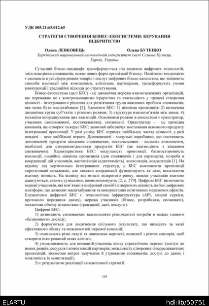 | Bibliographic citation (APA): | Levkovets, O., & Butenko, O. (2025). Stratehiia stvorennia biznes-ekosystemy: keruvannia vidkrytistiu. Proceeding of Ⅳ International Scientific and Practical Conference: “Business Transformation for Sustainable Future: Research, Digitalization and Innovation”, 4-5 December 2025, Ternopil, 105-108. FOP Palyanytsya V. A.. [in Ukrainian]. |