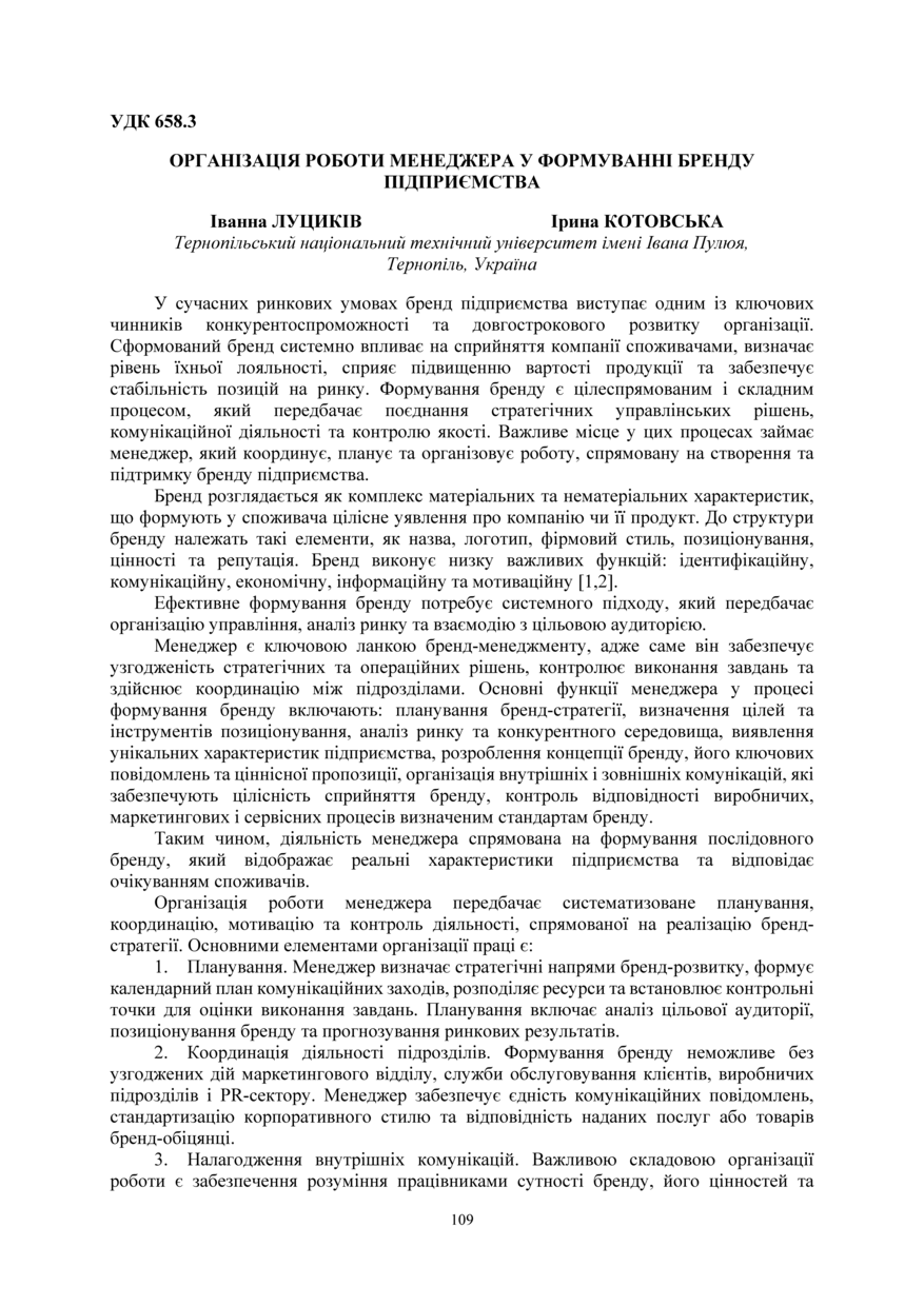 Bibliographic citation (APA): Lutsykiv, I. V., & Kotovska, I. V. (2025). Orhanizatsiia roboty menedzhera u formuvanni brendu pidpryiemstva. Proceeding of Ⅳ International Scientific and Practical Conference: “Business Transformation for Sustainable Future: Research, Digitalization and Innovation”, 4-5 December 2025, Ternopil, 109-110. FOP Palyanytsya V. A.. [in Ukrainian].