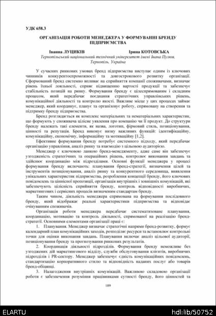 Bibliographic citation (CHICAGO): Lutsykiv I. V., Kotovska I. V. (2025) Orhanizatsiia roboty menedzhera u formuvanni brendu pidpryiemstva. Proceeding of Ⅳ International Scientific and Practical Conference: “Business Transformation for Sustainable Future: Research, Digitalization and Innovation” (Tern., 4-5 December 2025), pp. 109-110 [in Ukrainian].