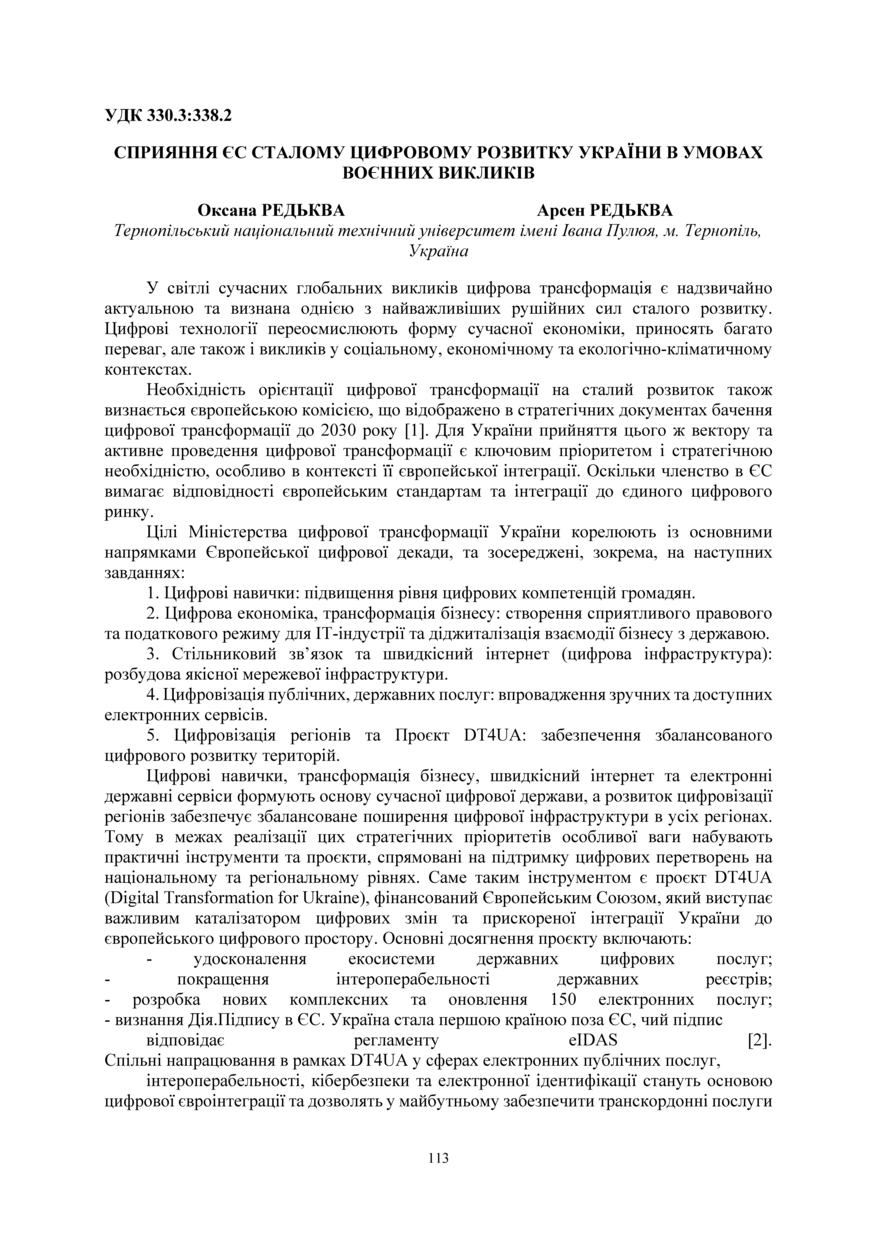 | Bibliographic citation (APA): | Redkva, O. Z., & Redkva, A. (2025). Spryiannia YeS stalomu tsyfrovomu rozvytku Ukrainy v umovakh voiennykh vyklykiv. Proceeding of Ⅳ International Scientific and Practical Conference: “Business Transformation for Sustainable Future: Research, Digitalization and Innovation”, 4-5 December 2025, Ternopil, 113-114. FOP Palyanytsya V. A.. [in Ukrainian]. |