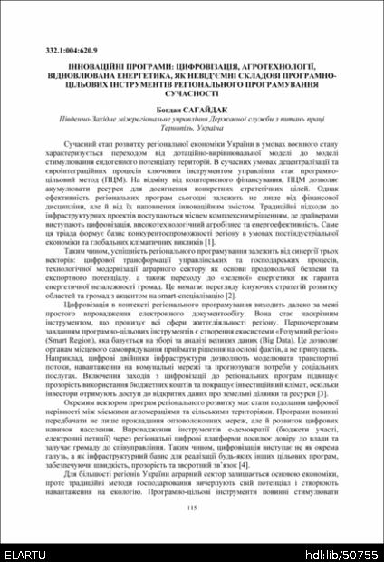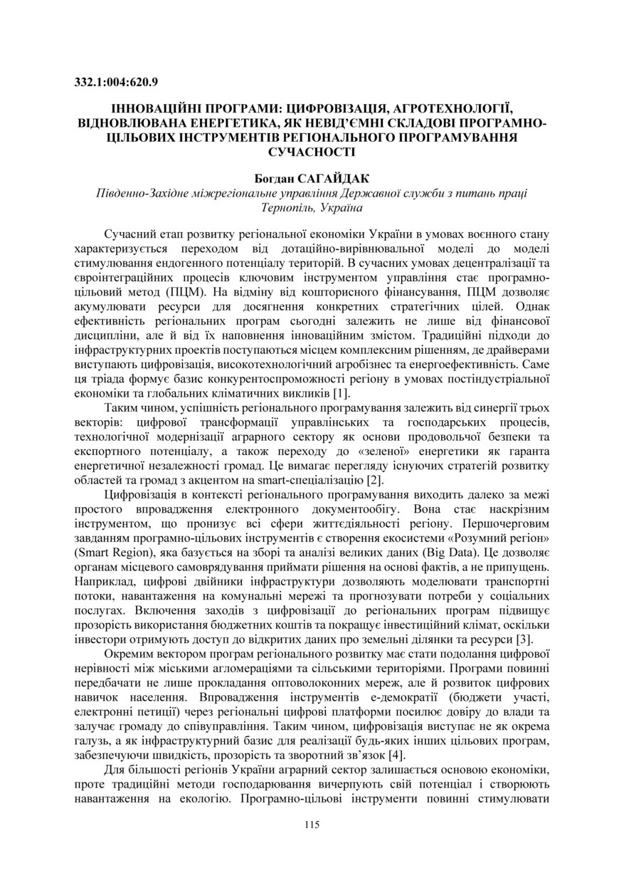 | Bibliographic reference (2015): | Сагайдак Б. Інноваційні програми: цифровізація, агротехнології відновлювана енергетика, як невід’ємні складові програмно цільових інструментів регіонального програмування сучасності // Збірник тез доповідей Ⅳ Міжнародної науково-практичної конференції „Трансформація бізнесу для сталого майбутнього: дослідження, цифровізація та інновації“, Тернопіль, 4-5 грудня 2025 року. 2025. С. 115–116. |