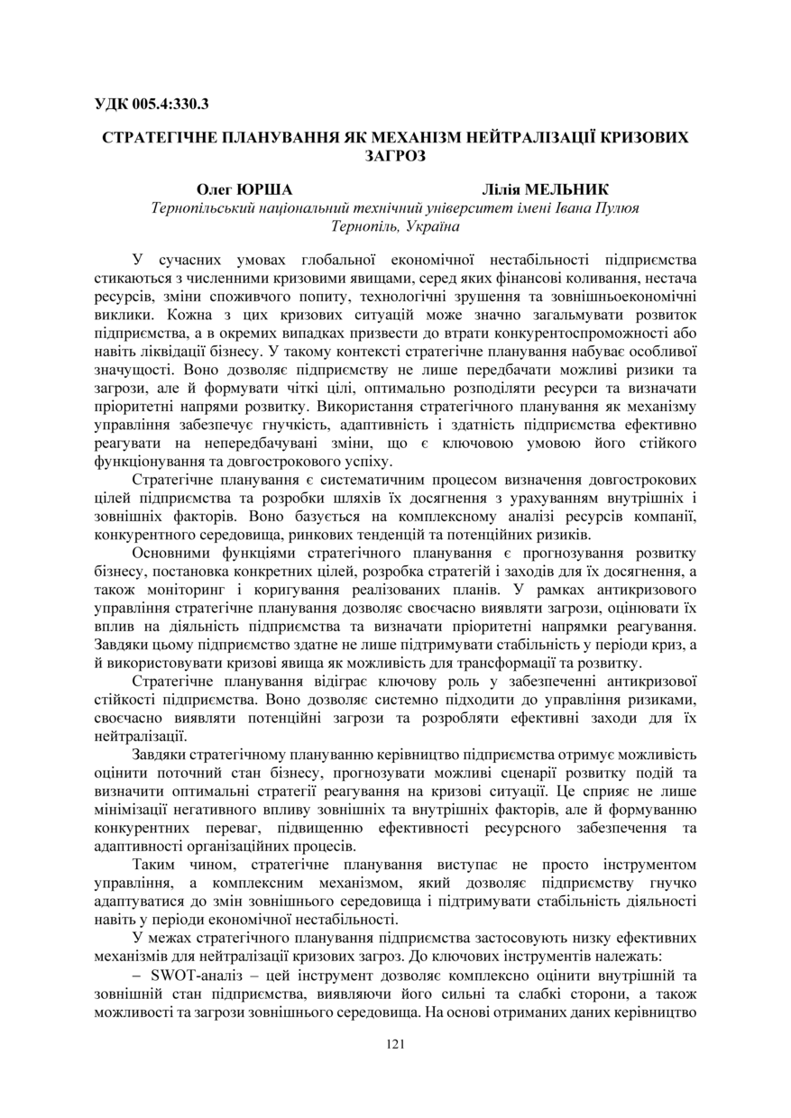 | Bibliographic citation (APA): | Iursha, O., & Melnik, L. M. (2025). Stratehichne planuvannia yak mekhanizm neitralizatsii kryzovykh zahroz. Proceeding of Ⅳ International Scientific and Practical Conference: “Business Transformation for Sustainable Future: Research, Digitalization and Innovation”, 4-5 December 2025, Ternopil, 121-122. FOP Palyanytsya V. A.. [in Ukrainian]. |