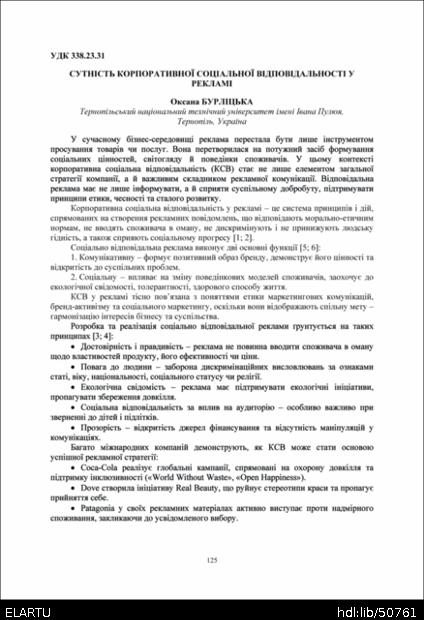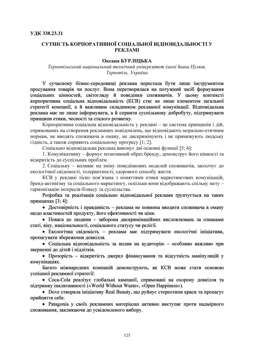 | Bibliographic citation (APA): | Burlitska, O. P. (2025). Sutnist korporatyvnoi sotsialnoi vidpovidalnosti u reklami. Proceeding of Ⅳ International Scientific and Practical Conference: “Business Transformation for Sustainable Future: Research, Digitalization and Innovation”, 4-5 December 2025, Ternopil, 125-126. FOP Palyanytsya V. A.. [in Ukrainian]. |