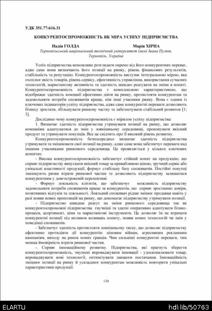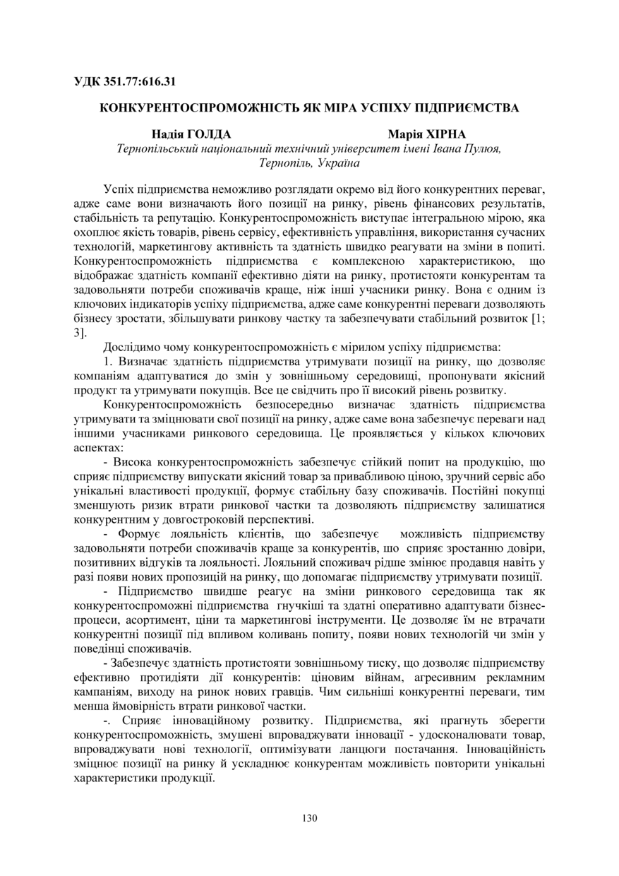Bibliographic citation (APA): Holda, N. M., & Khirna, M. (2025). Konkurentospromozhnist yak mira uspikhu pidpryiemstva. Proceeding of Ⅳ International Scientific and Practical Conference: “Business Transformation for Sustainable Future: Research, Digitalization and Innovation”, 4-5 December 2025, Ternopil, 130-131. FOP Palyanytsya V. A.. [in Ukrainian].