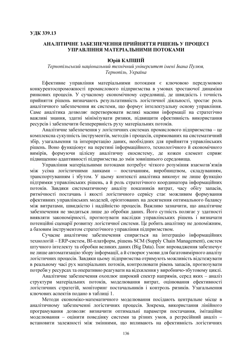 Bibliographic citation (CHICAGO): Kapshii Yu. (2025) Analitychne zabezpechennia pryiniattia rishen u protsesi upravlinnia materialnymy potokamy. Proceeding of Ⅳ International Scientific and Practical Conference: “Business Transformation for Sustainable Future: Research, Digitalization and Innovation” (Tern., 4-5 December 2025), pp. 136-137 [in Ukrainian].