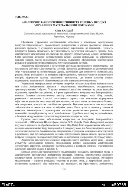 Бібліографічний опис: Капшій Ю. Аналітичне забезпечення прийняття рішень у процесі управління матеріальними потоками / Юрій Капшій // Збірник тез доповідей Ⅳ Міжнародної науково-практичної конференції „Трансформація бізнесу для сталого майбутнього: дослідження, цифровізація та інновації“, 4-5 грудня 2025 року. — Т. : ФОП Паляниця В. А., 2025. — С. 136–137. — (Стратегічні рішення в маркетингу та логістиці: сучасні підходи для підвищення ефективності бізнесу).