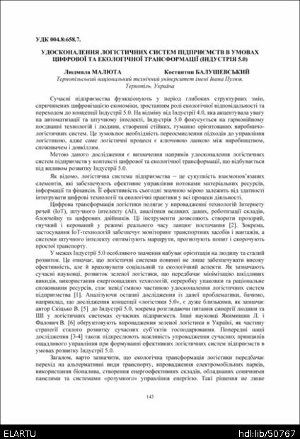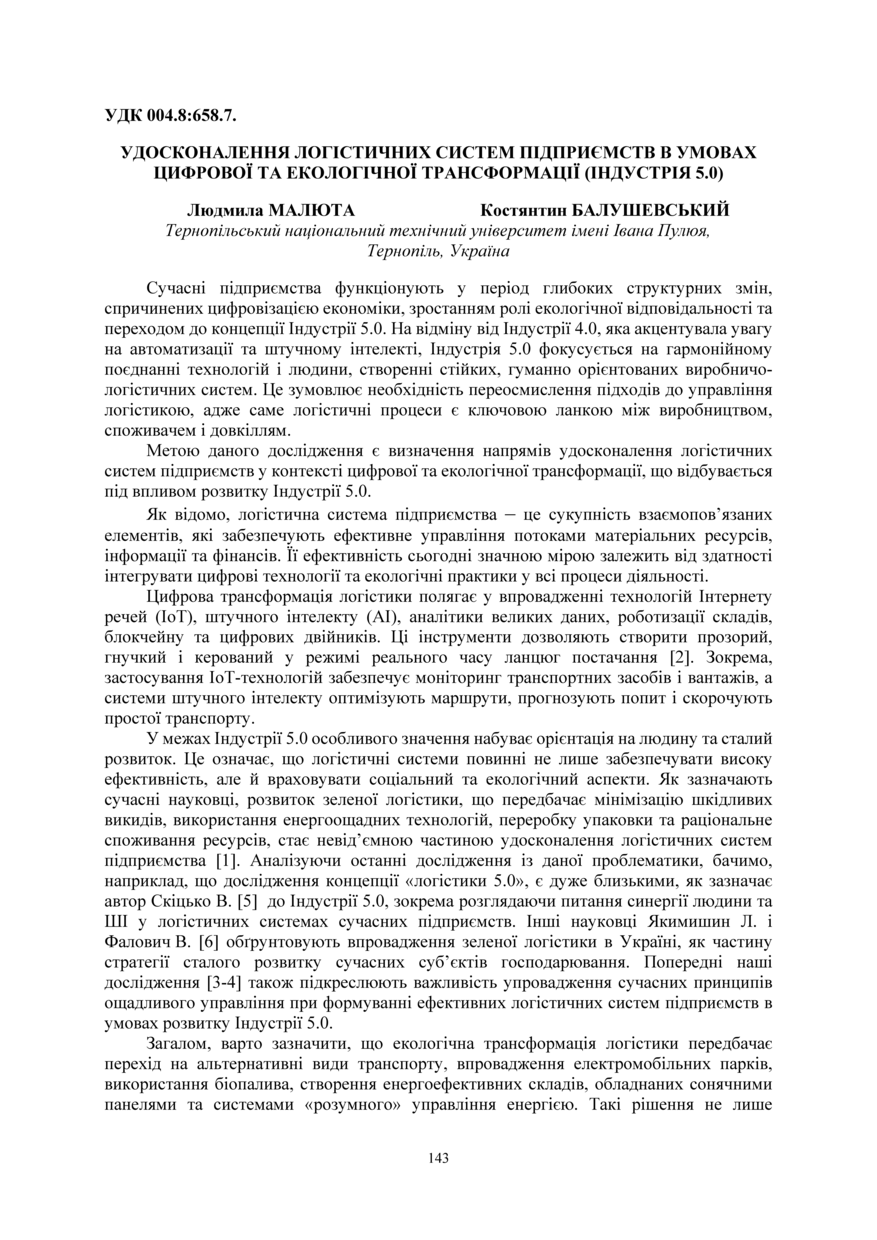 | Bibliographic citation (APA): | Maliuta, L. Ia., & Balushevskii, K. (2025). Udoskonalennia lohistychnykh system pidpryiemstv v umovakh tsyfrovoi ta ekolohichnoi transformatsii (industriia 5.0). Proceeding of Ⅳ International Scientific and Practical Conference: “Business Transformation for Sustainable Future: Research, Digitalization and Innovation”, 4-5 December 2025, Ternopil, 143-145. FOP Palyanytsya V. A.. [in Ukrainian]. |