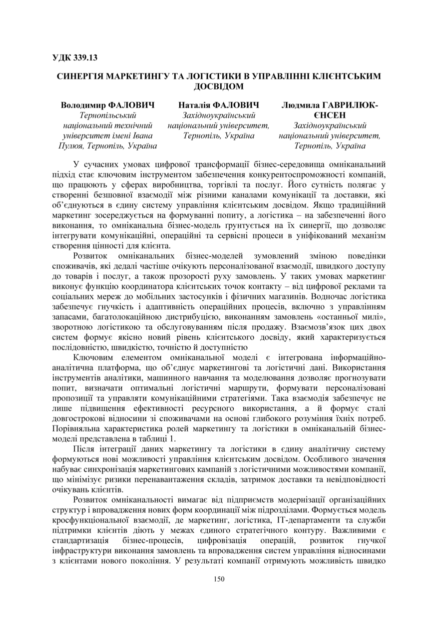 | Bibliographic citation (APA): | Falovich, V. A., Falovich, N., & Havryliuk-Yensen, L. (2025). Synerhiia marketynhu ta lohistyky v upravlinni kliientskym dosvidom. Proceeding of Ⅳ International Scientific and Practical Conference: “Business Transformation for Sustainable Future: Research, Digitalization and Innovation”, 4-5 December 2025, Ternopil, 150-153. FOP Palyanytsya V. A.. [in Ukrainian]. |