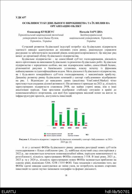 | Bibliographic citation (APA): | Kundeus, O. M., & Zarudna, N. (2025). Osoblyvosti budivelnoho vyrobnytstva ta yikh vplyv na orhanizatsiiu obliku. Proceeding of Ⅳ International Scientific and Practical Conference: “Business Transformation for Sustainable Future: Research, Digitalization and Innovation”, 4-5 December 2025, Ternopil, 18-20. FOP Palyanytsya V. A.. [in Ukrainian]. |