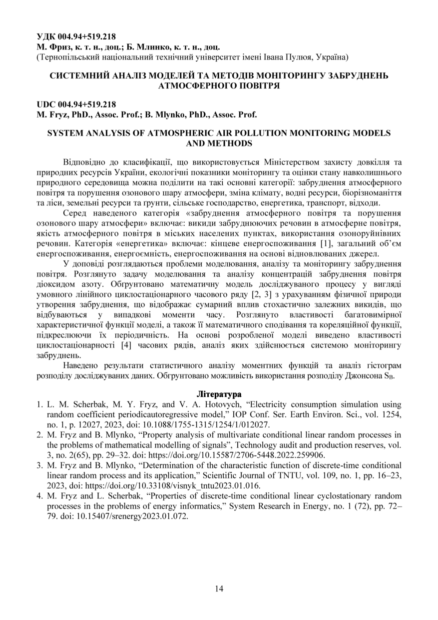 | Bibliographic citation (APA): | Fryz, M., & Mlynko, B. (2025). Systemnyi analiz modelei ta metodiv monitorynhu zabrudnen atmosfernoho povitria [System analysis of atmospheric air pollution monitoring models and methods]. Materials of the ⅩⅢ Scientific and Technical Conference “Information Models, Systems, and Technologies”, 17-18 December 2025, Ternopil, 14. TNTU. [in Ukrainian]. |