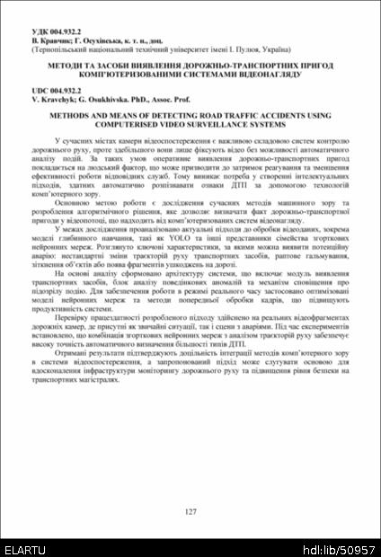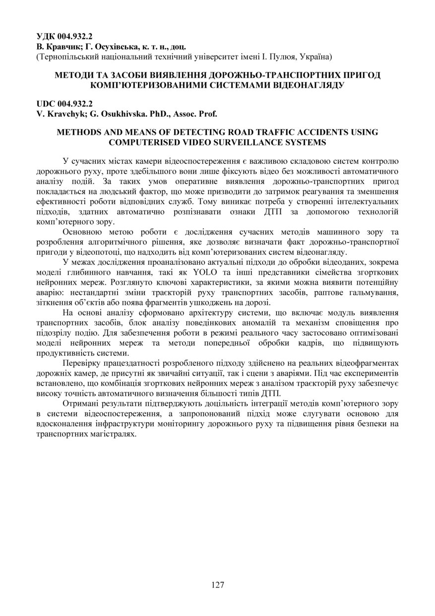 | Bibliographic citation (APA): | Kravchyk, V., & Osukhivska, G. (2025). Metody ta zasoby vyiavlennia dorozhno-transportnykh pryhod kompiuteryzovanymy systemamy videonahliadu [Methods and means of detecting road traffic accidents using computerised video surveillance systems]. Materials of the ⅩⅢ Scientific and Technical Conference “Information Models, Systems, and Technologies”, 17-18 December 2025, Ternopil, 127. TNTU. [in Ukrainian]. |