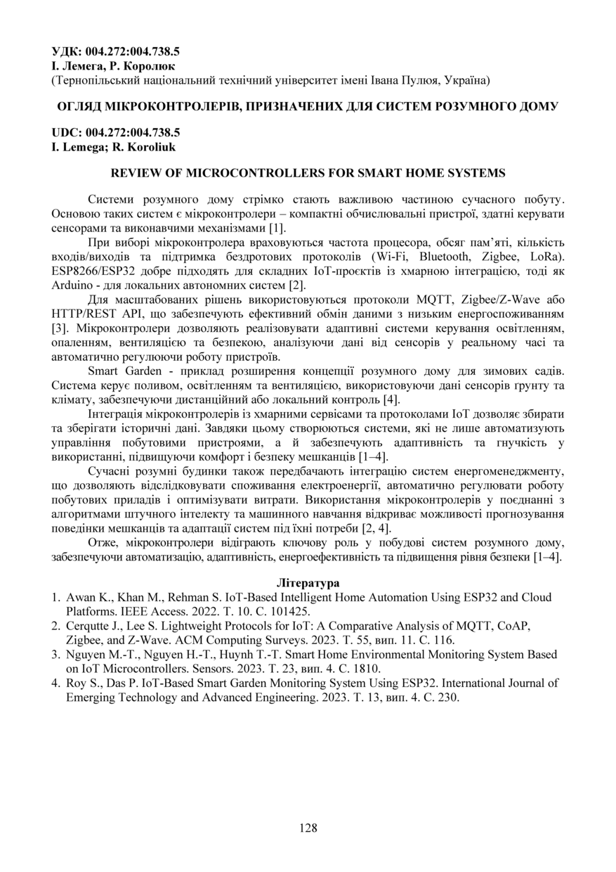 | Bibliographic citation (APA): | Lemega, I., & Koroliuk, R. (2025). Ohliad mikrokontroleriv, pryznachenykh dlia system rozumnoho domu [Review of microcontrollers for smart home systems]. Materials of the ⅩⅢ Scientific and Technical Conference “Information Models, Systems, and Technologies”, 17-18 December 2025, Ternopil, 128. TNTU. [in Ukrainian]. |