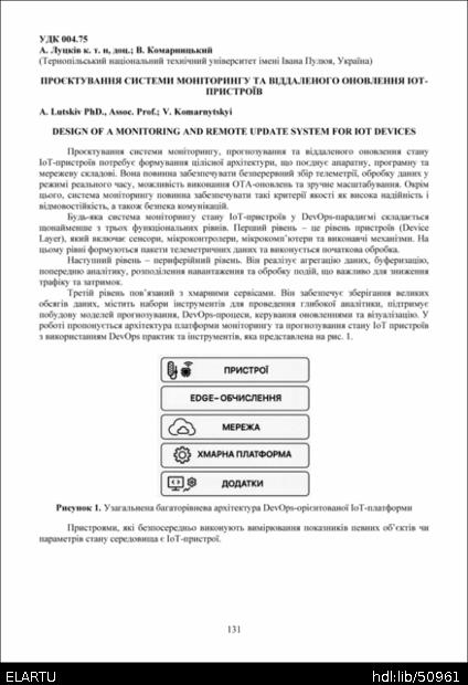 | Bibliographic citation (APA): | Lutskiv, A., & Komarnytskyi, V. (2025). Proiektuvannia systemy monitorynhu ta viddalenoho onovlennia iot-prystroiv [Design of a monitoring and remote update system for iot devices]. Materials of the ⅩⅢ Scientific and Technical Conference “Information Models, Systems, and Technologies”, 17-18 December 2025, Ternopil, 131. TNTU. [in Ukrainian]. |