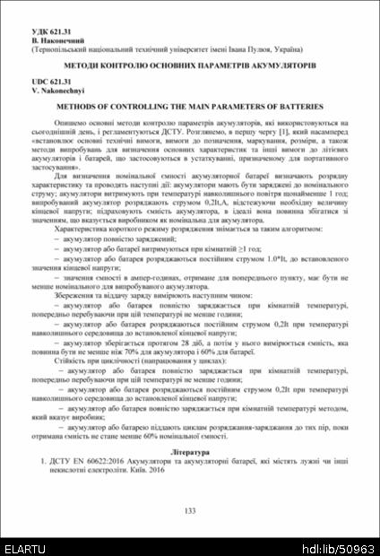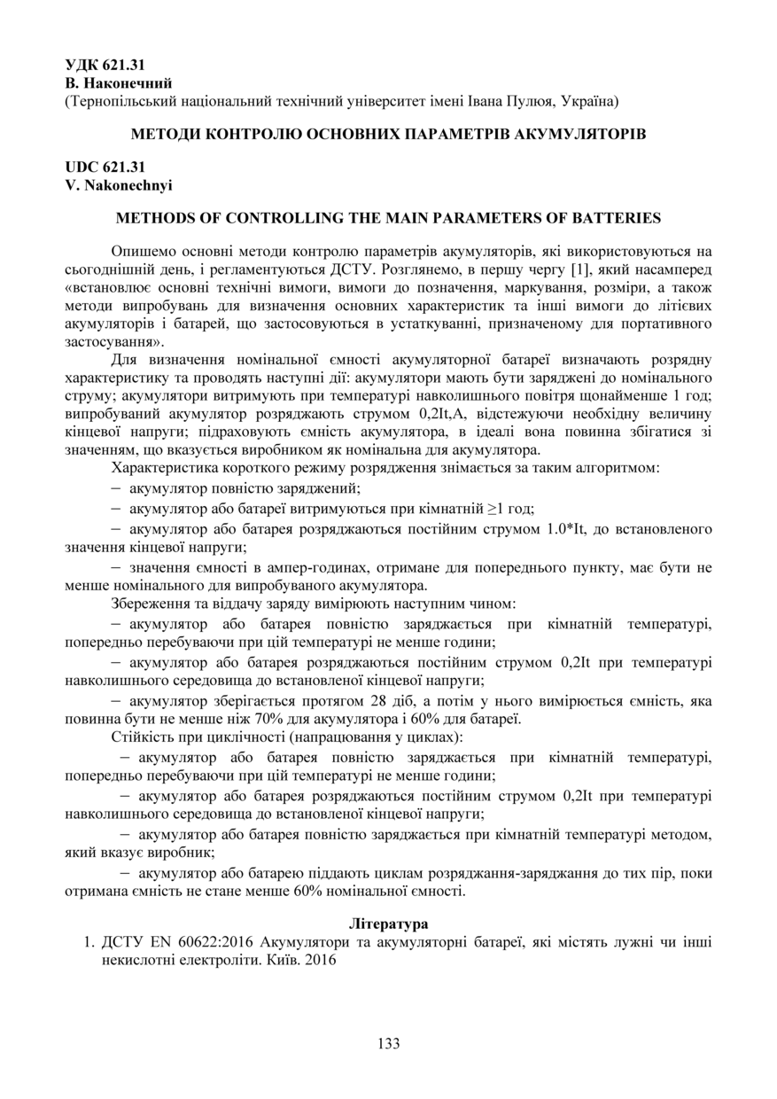 References (International): 1. DSTU EN 60622:2016 Akumuliatory ta akumuliatorni batarei, yaki mistiat luzhni chy inshi nekyslotni elektrolity. Kyiv. 2016