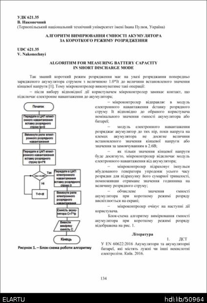 Bibliographic citation (CHICAGO): Nakonechnyi V. (2025) Alhorytm vymiriuvannia yemnosti akumuliatora za korotkoho rezhymu rozriadzhennia [Algorithm for measuring battery capacity in short discharge mode]. Materials of the ⅩⅢ Scientific and Technical Conference “Information Models, Systems, and Technologies” (Tern., 17-18 December 2025), pp. 134 [in Ukrainian].