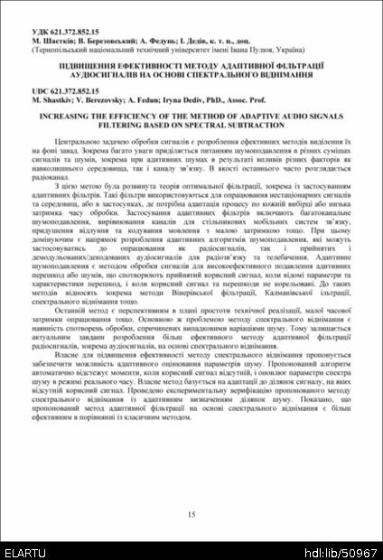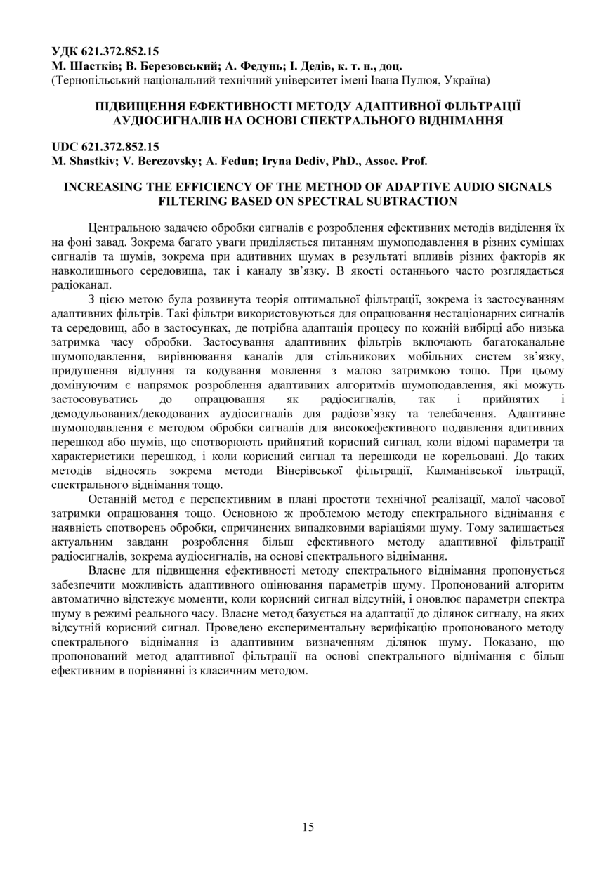 | Bibliographic citation (APA): | Shastkiv, M., Berezovsky, V., Fedun, A., & Dediv, I. (2025). Pidvyshchennia efektyvnosti metodu adaptyvnoi filtratsii audiosyhnaliv na osnovi spektralnoho vidnimannia [Increasing the efficiency of the method of adaptive audio signals filtering based on spectral subtraction]. Materials of the ⅩⅢ Scientific and Technical Conference “Information Models, Systems, and Technologies”, 17-18 December 2025, Ternopil, 15. TNTU. [in Ukrainian]. |