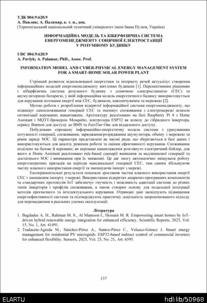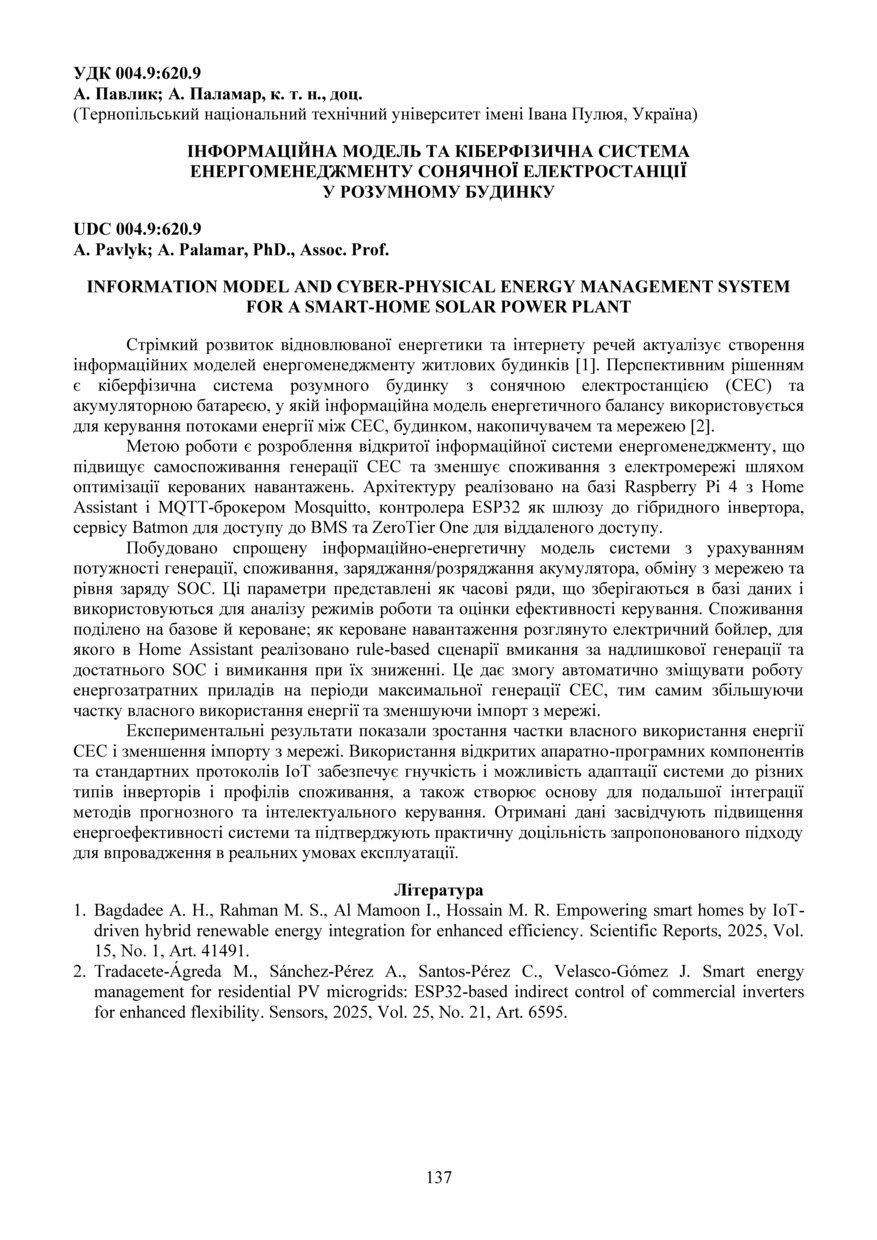 | Bibliographic citation (APA): | Pavlyk, A., & Palamar, A. (2025). Informatsiina model ta kiberfizychna systema enerhomenedzhmentu soniachnoi elektrostantsii u rozumnomu budynku [Information model and cyber-physical energy management system for a smart-home solar power plant]. Materials of the ⅩⅢ Scientific and Technical Conference “Information Models, Systems, and Technologies”, 17-18 December 2025, Ternopil, 137. TNTU. [in Ukrainian]. |