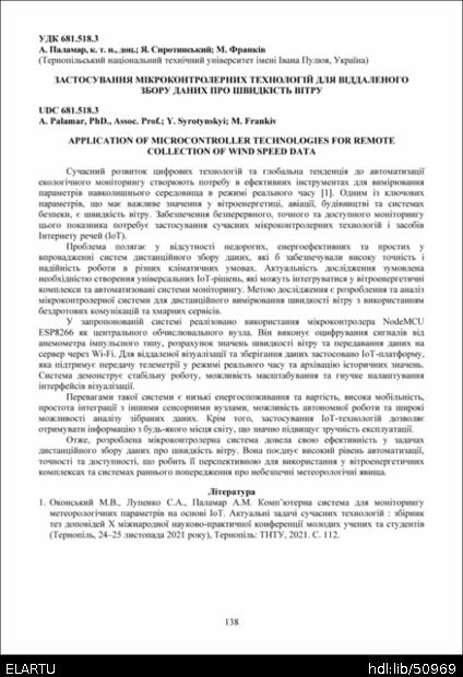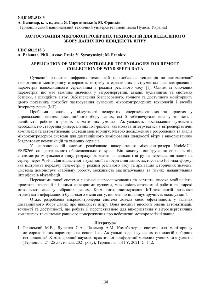 | Bibliographic citation (APA): | Palamar, A., Syrotynskyi, Y., & Frankiv, M. (2025). Zastosuvannia mikrokontrolernykh tekhnolohii dlia viddalenoho zboru danykh pro shvydkist vitru [Application of microcontroller technologies for remote collection of wind speed data]. Materials of the ⅩⅢ Scientific and Technical Conference “Information Models, Systems, and Technologies”, 17-18 December 2025, Ternopil, 138. TNTU. [in Ukrainian]. |
