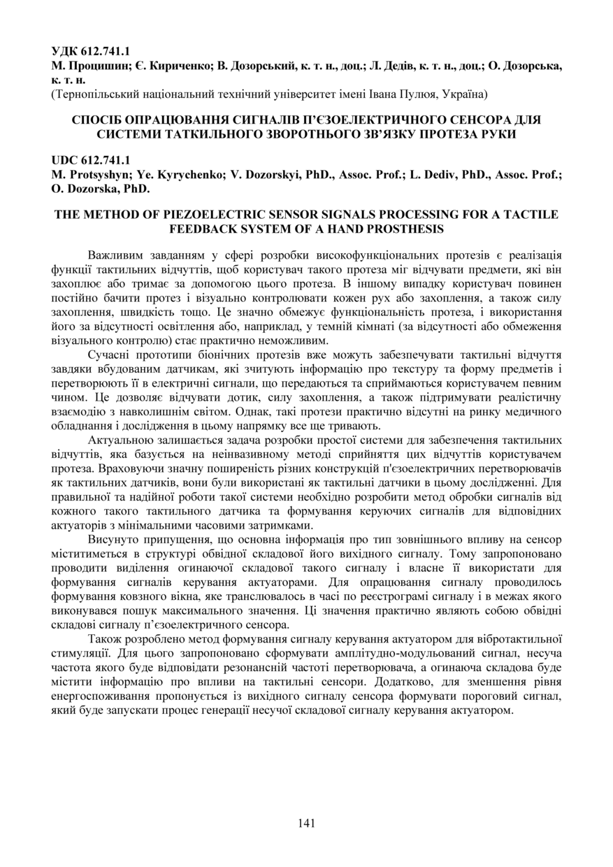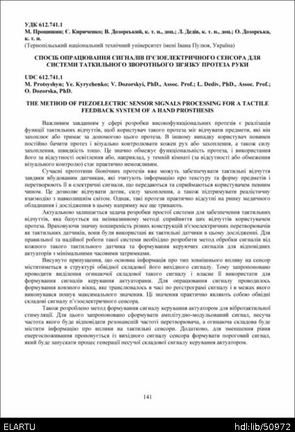 | Назва: | Спосіб опрацювання сигналів п’єзоелектричного сенсора для системи таткильного зворотнього зв’язку протеза руки |