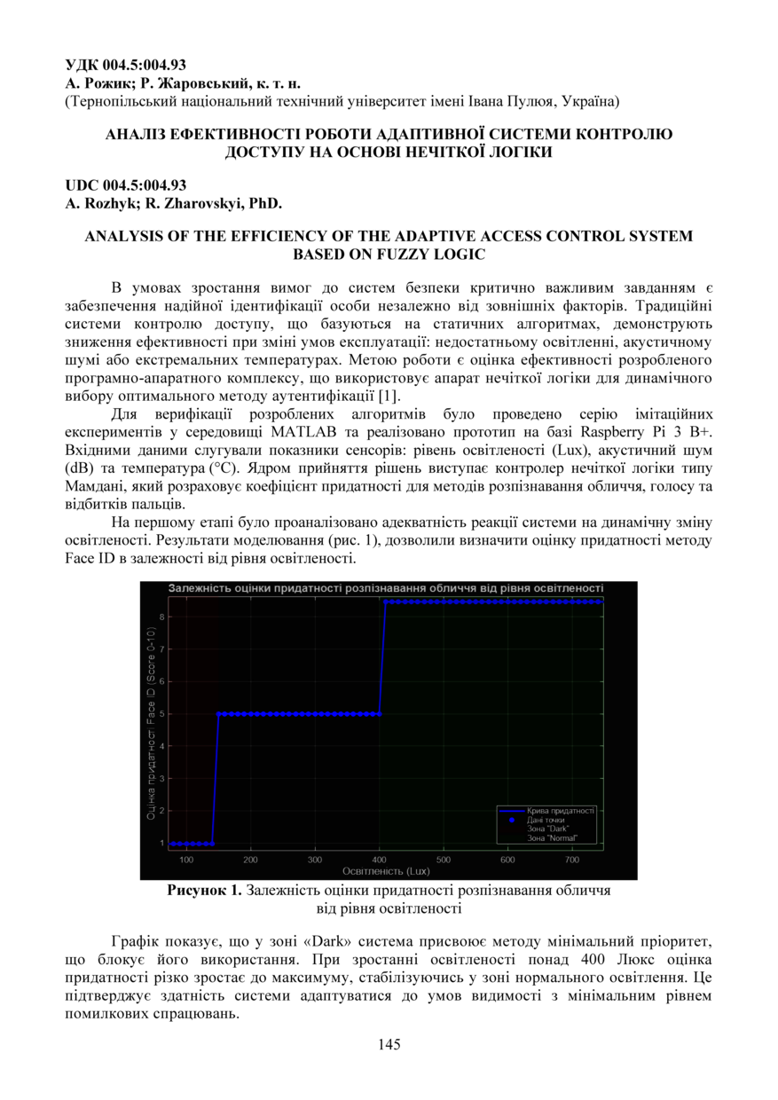 | Bibliographic citation (APA): | Rozhyk, A., & Zharovskyi, R. (2025). Analiz efektyvnosti roboty adaptyvnoi systemy kontroliu dostupu na osnovi nechitkoi lohiky [Analysis of the efficiency of the adaptive access control system based on fuzzy logic]. Materials of the ⅩⅢ Scientific and Technical Conference “Information Models, Systems, and Technologies”, 17-18 December 2025, Ternopil, 145-147. TNTU. [in Ukrainian]. |