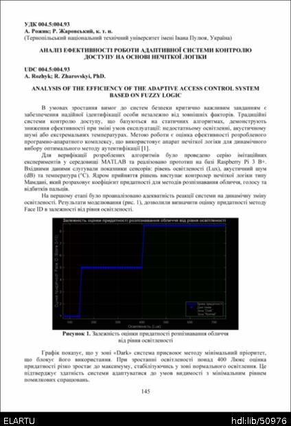 | Bibliographic citation (CHICAGO): | Rozhyk A., Zharovskyi R. (2025) Analiz efektyvnosti roboty adaptyvnoi systemy kontroliu dostupu na osnovi nechitkoi lohiky [Analysis of the efficiency of the adaptive access control system based on fuzzy logic]. Materials of the ⅩⅢ Scientific and Technical Conference “Information Models, Systems, and Technologies” (Tern., 17-18 December 2025), pp. 145-147 [in Ukrainian]. |
