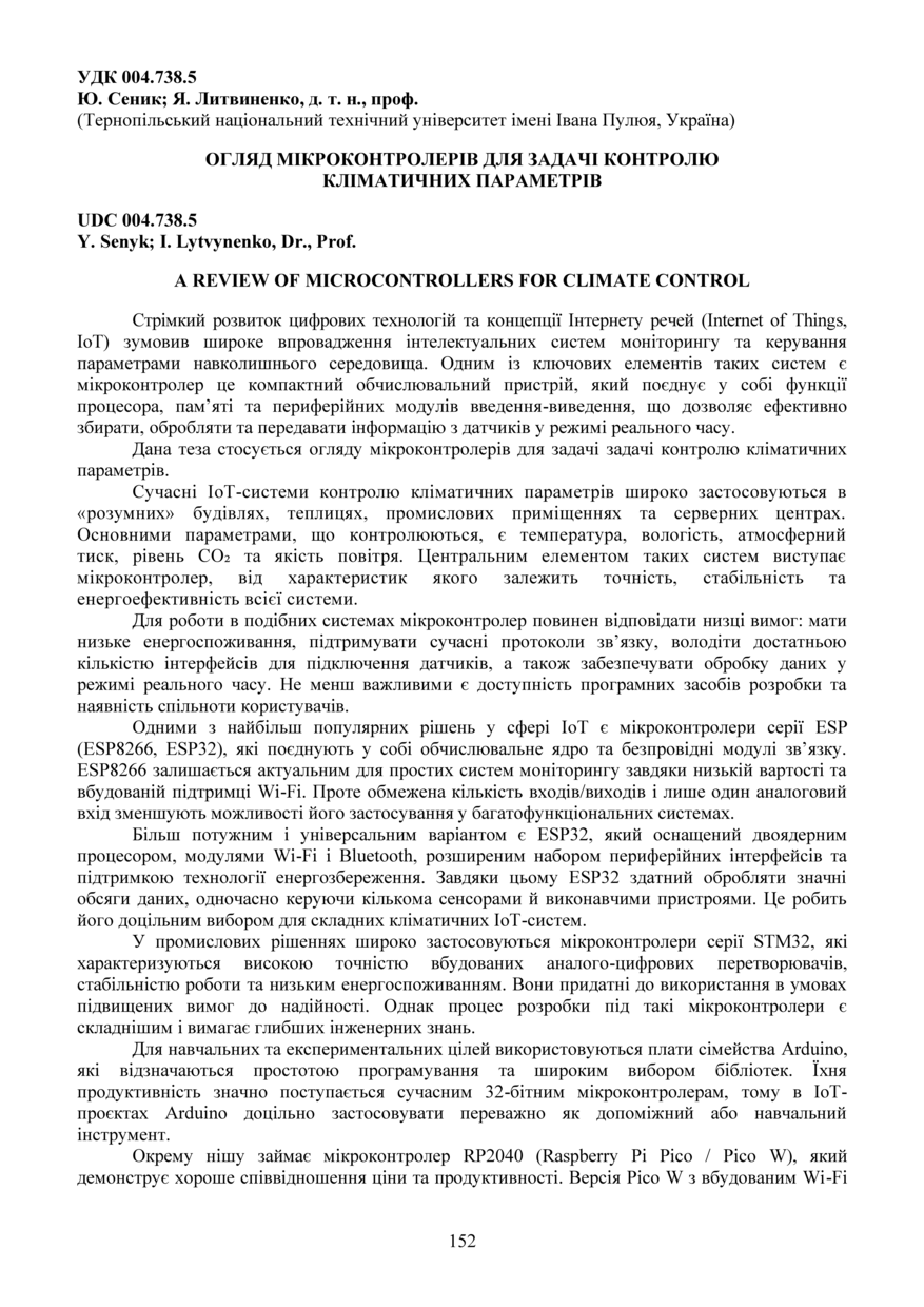 | Bibliographic citation (APA): | Senyk, Y., & Lytvynenko, I. (2025). Ohliad mikrokontroleriv dlia zadachi kontroliu klimatychnykh parametriv [A review of microcontrollers for climate control]. Materials of the ⅩⅢ Scientific and Technical Conference “Information Models, Systems, and Technologies”, 17-18 December 2025, Ternopil, 152-153. TNTU. [in Ukrainian]. |
