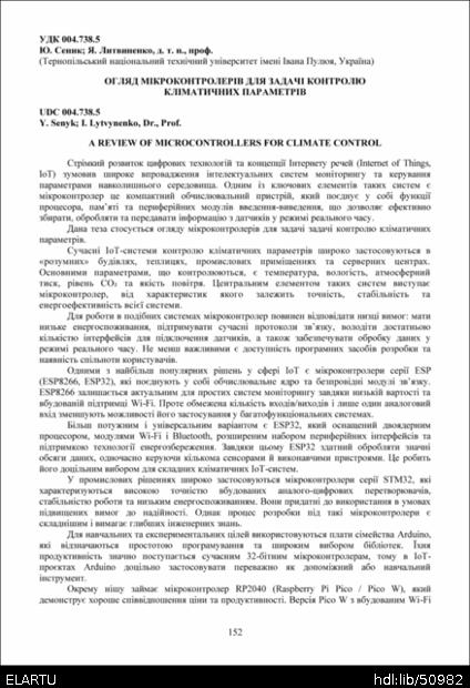 | Bibliographic citation (CHICAGO): | Senyk Y., Lytvynenko I. (2025) Ohliad mikrokontroleriv dlia zadachi kontroliu klimatychnykh parametriv [A review of microcontrollers for climate control]. Materials of the ⅩⅢ Scientific and Technical Conference “Information Models, Systems, and Technologies” (Tern., 17-18 December 2025), pp. 152-153 [in Ukrainian]. |