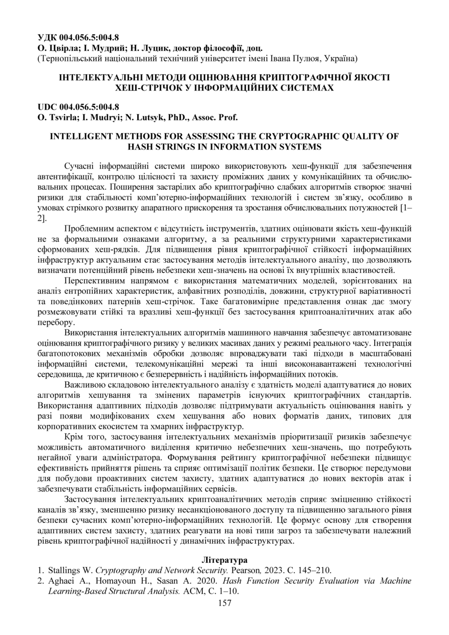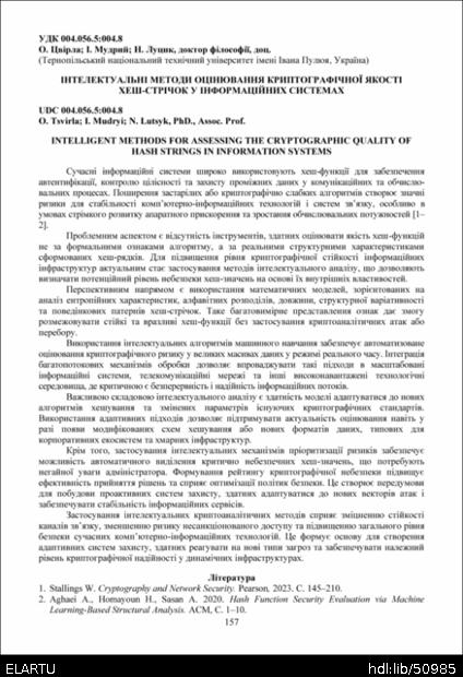 | Bibliographic citation (APA): | Tsvirla, O., Mudryi, I., & Lutsyk, N. (2025). Intelektualni metody otsiniuvannia kryptohrafichnoi yakosti khesh-strichok u informatsiinykh systemakh [Intelligent methods for assessing the cryptographic quality of hash strings in information systems]. Materials of the ⅩⅢ Scientific and Technical Conference “Information Models, Systems, and Technologies”, 17-18 December 2025, Ternopil, 157. TNTU. [in Ukrainian]. |