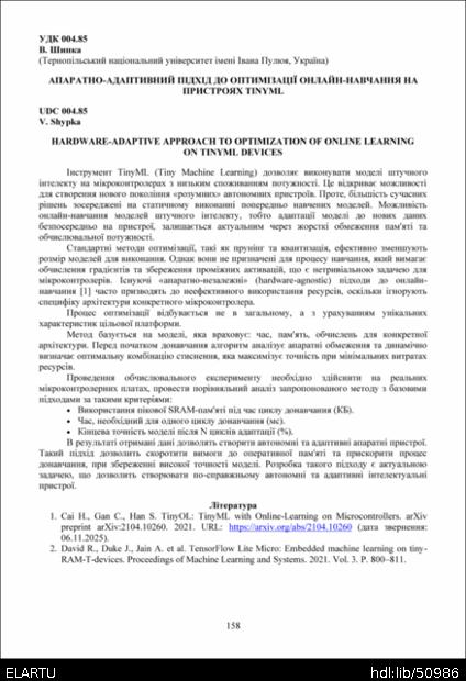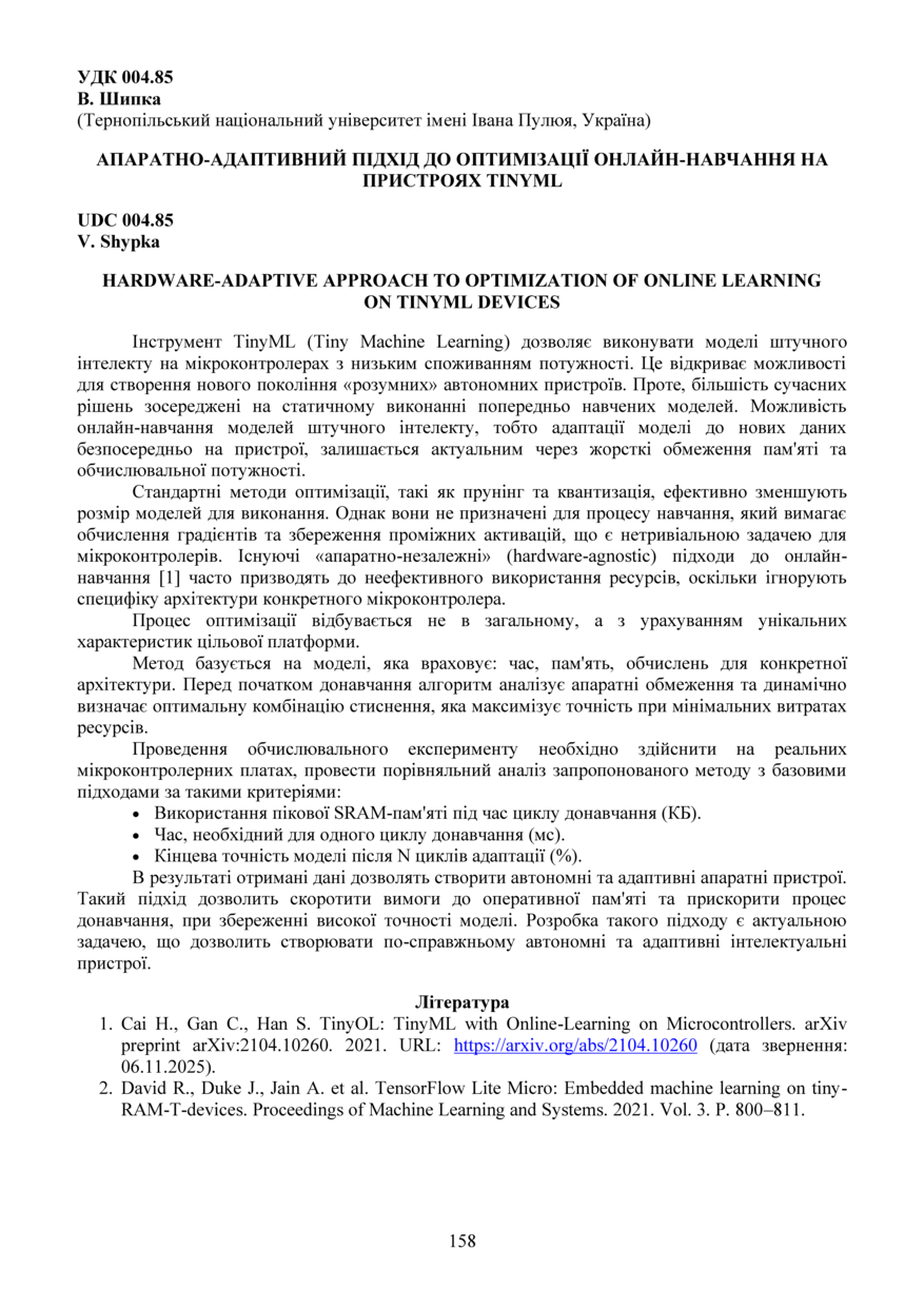 | Bibliographic citation (APA): | Shypka, V. (2025). Aparatno-adaptyvnyi pidkhid do optymizatsii onlain-navchannia na prystroiakh tinyml [Hardware-adaptive approach to optimization of online learning on tinyml devices]. Materials of the ⅩⅢ Scientific and Technical Conference “Information Models, Systems, and Technologies”, 17-18 December 2025, Ternopil, 158. TNTU. [in Ukrainian]. |