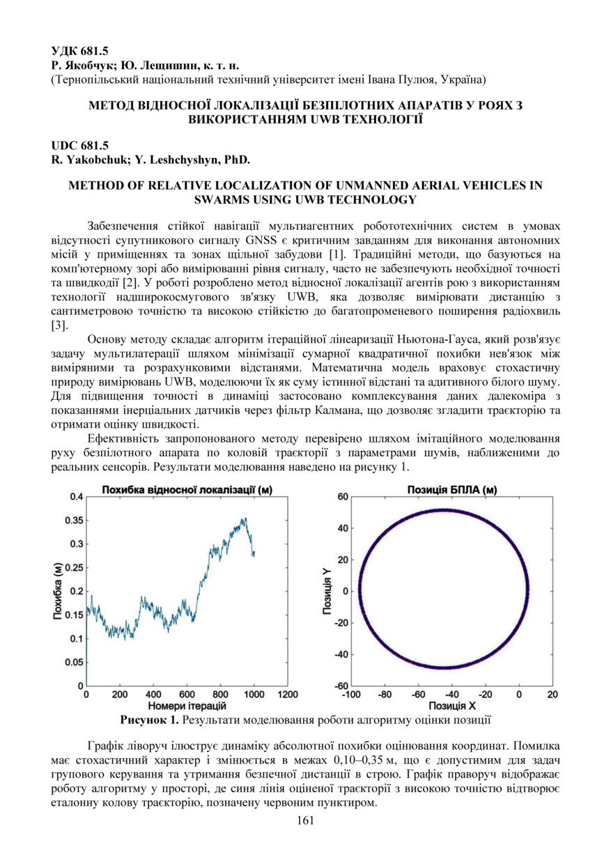 | Bibliographic reference (2015): | Якобчук Р., Лещишин Ю. З. Метод відносної локалізації безпілотних апаратів у роях з використанням uwb технології // Матеріали ⅩⅢ науково-технічної конференції „Інформаційні моделі, системи та технології“, Тернопіль, 17-18 грудня 2025 року. 2025. С. 161–162. |