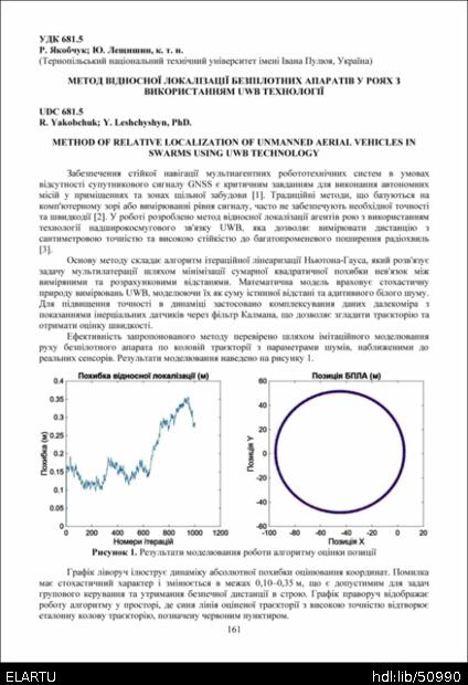 | Bibliographic citation (APA): | Yakobchuk, R., & Leshchyshyn, Y. (2025). Metod vidnosnoi lokalizatsii bezpilotnykh aparativ u roiakh z vykorystanniam uwb tekhnolohii [Method of relative localization of unmanned aerial vehicles in swarms using uwb technology]. Materials of the ⅩⅢ Scientific and Technical Conference “Information Models, Systems, and Technologies”, 17-18 December 2025, Ternopil, 161-162. TNTU. [in Ukrainian]. |