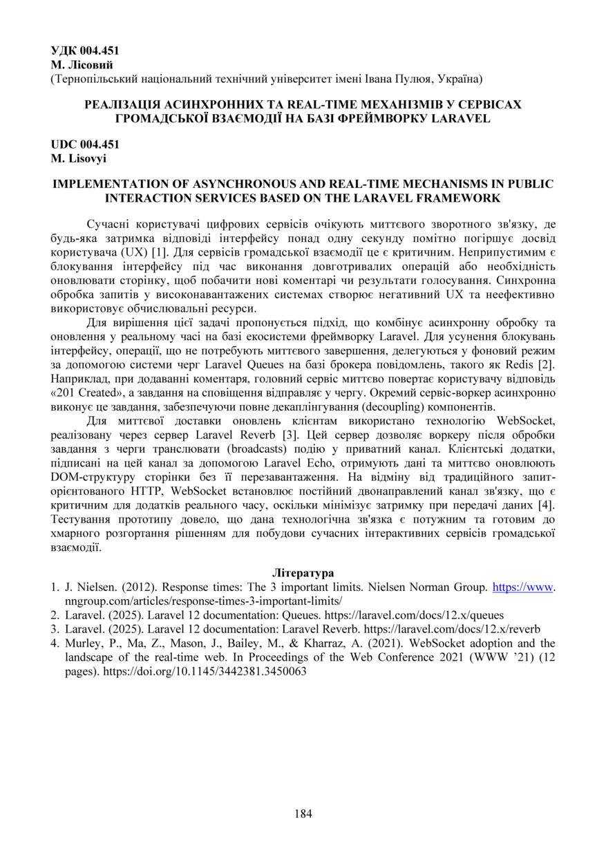 | URL-посилання пов’язаного матеріалу: | https://www.nngroup.com/articles/response-times-3-important-limits/ https://laravel.com/docs/12.x/queues https://laravel.com/docs/12.x/reverb https://doi.org/10.1145/3442381.3450063 |