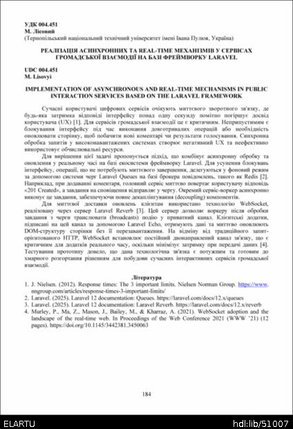 | Bibliographic citation (APA): | Lisovyi, M. (2025). Realizatsiia asynkhronnykh ta real-time mekhanizmiv u servisakh hromadskoi vzaiemodii na bazi freimvorku laravel [Implementation of asynchronous and real-time mechanisms in public interaction services based on the laravel framework]. Materials of the ⅩⅢ Scientific and Technical Conference “Information Models, Systems, and Technologies”, 17-18 December 2025, Ternopil, 184. TNTU. [in Ukrainian]. |