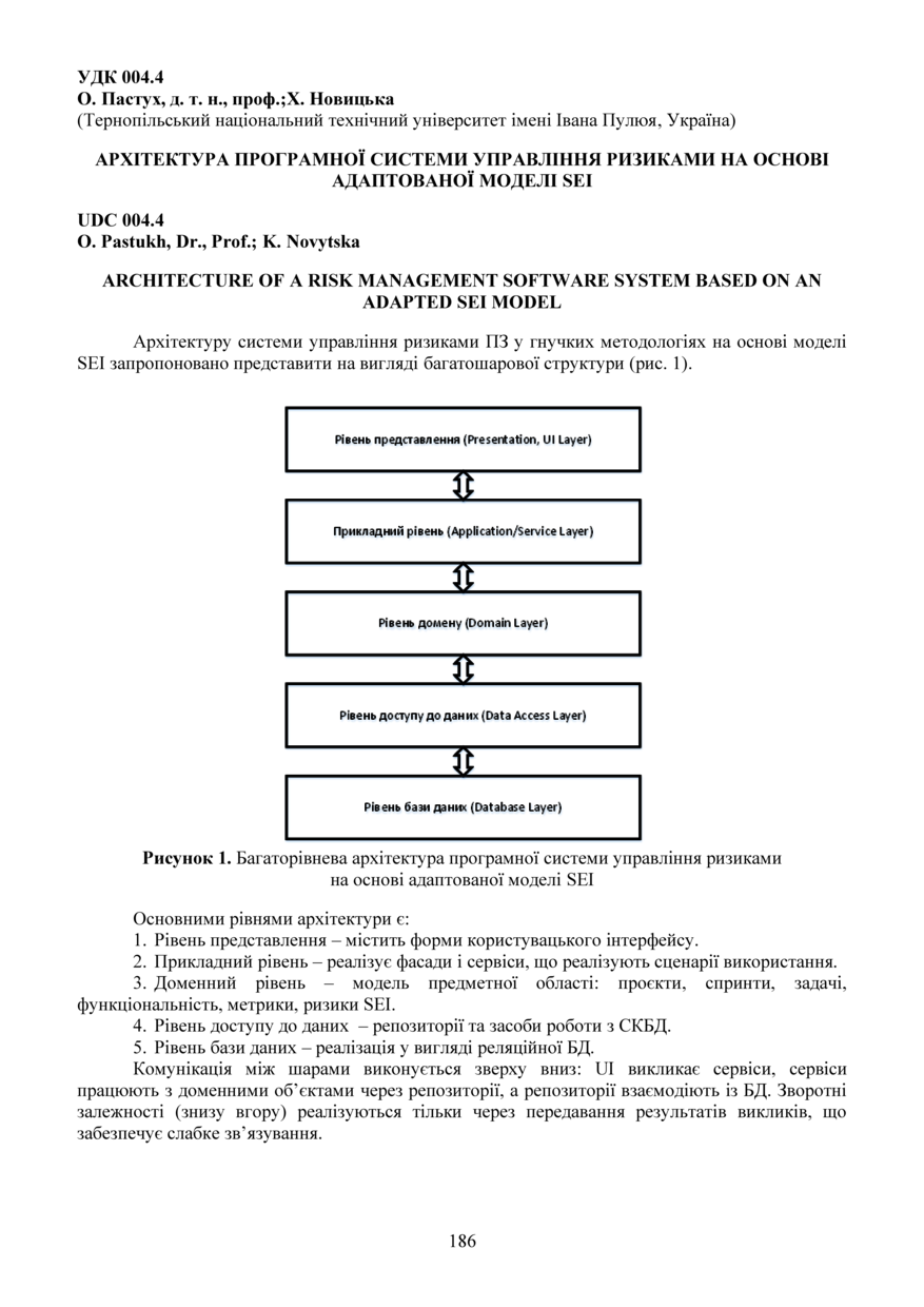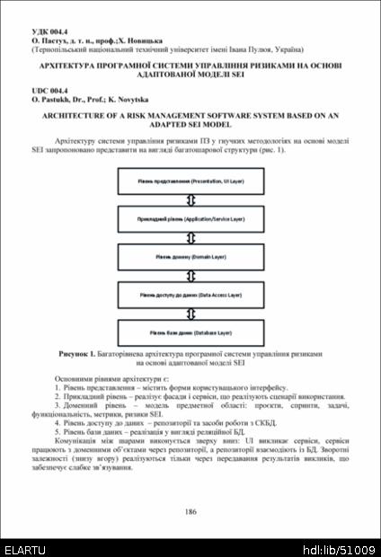 | Bibliographic citation (APA): | Pastukh, O., & Novytska, K. (2025). Arkhitektura prohramnoi systemy upravlinnia ryzykamy na osnovi adaptovanoi modeli sei [Architecture of a risk management software system based on an adapted sei model]. Materials of the ⅩⅢ Scientific and Technical Conference “Information Models, Systems, and Technologies”, 17-18 December 2025, Ternopil, 186. TNTU. [in Ukrainian]. |